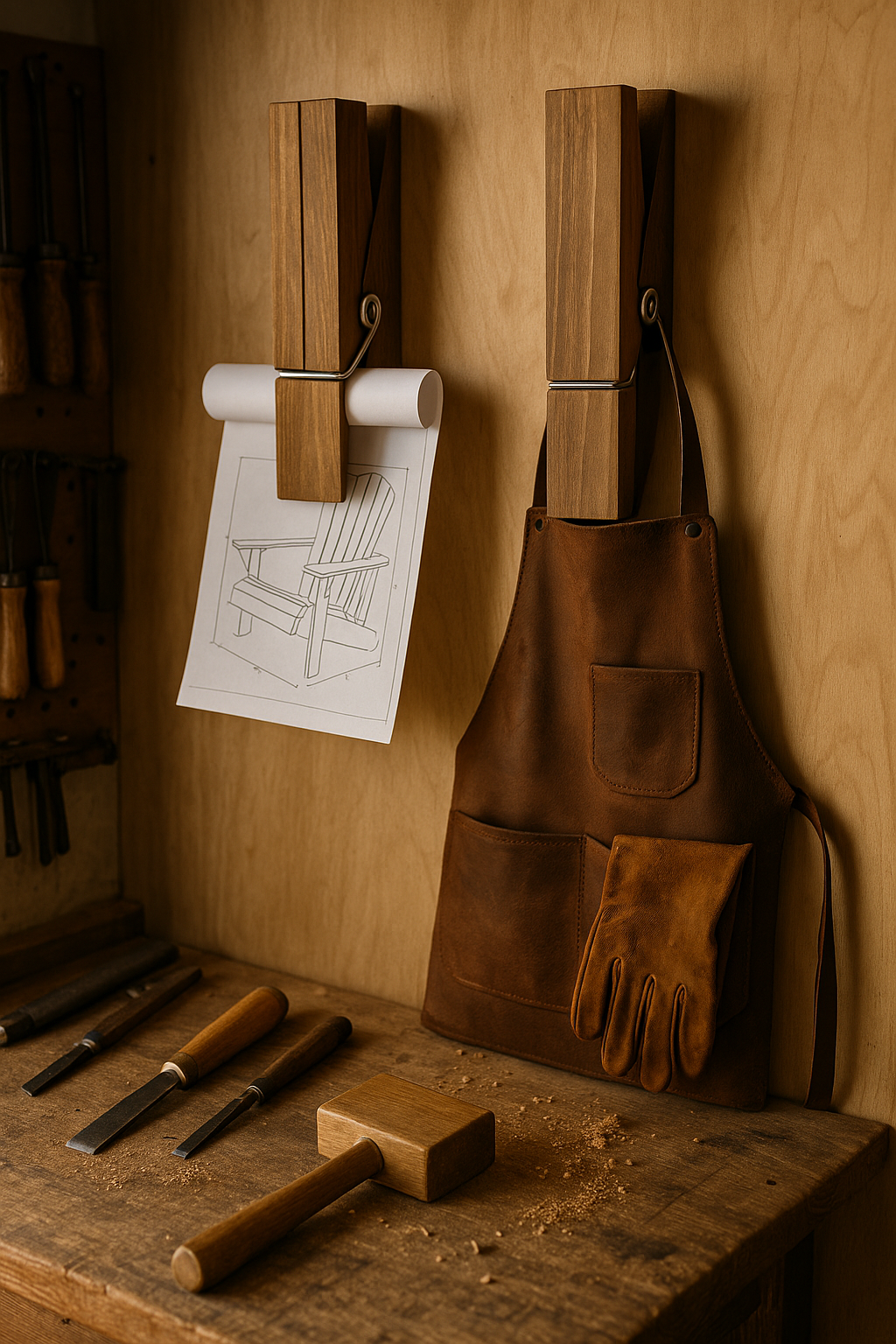 - 🔨 Atelier bois : plans suspendus, gants, tablier